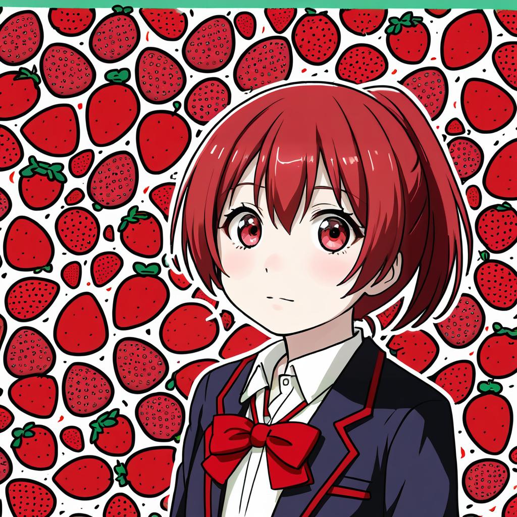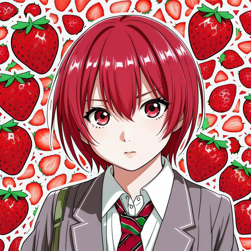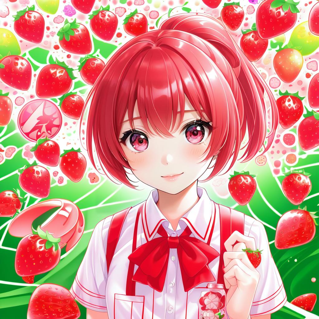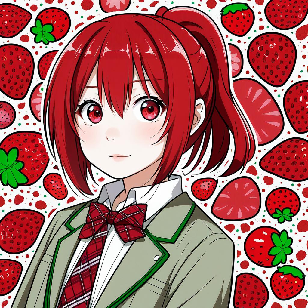 Anime-style illustration of a young girl with red eyes and red hair tied in a ponytail. She is wearing a school uniform consisting of a gray blazer with green trim, a white shirt, and a red plaid bow tie. The background is filled with various bright red strawberries, both whole and sliced, creating a vibrant and playful atmosphere.