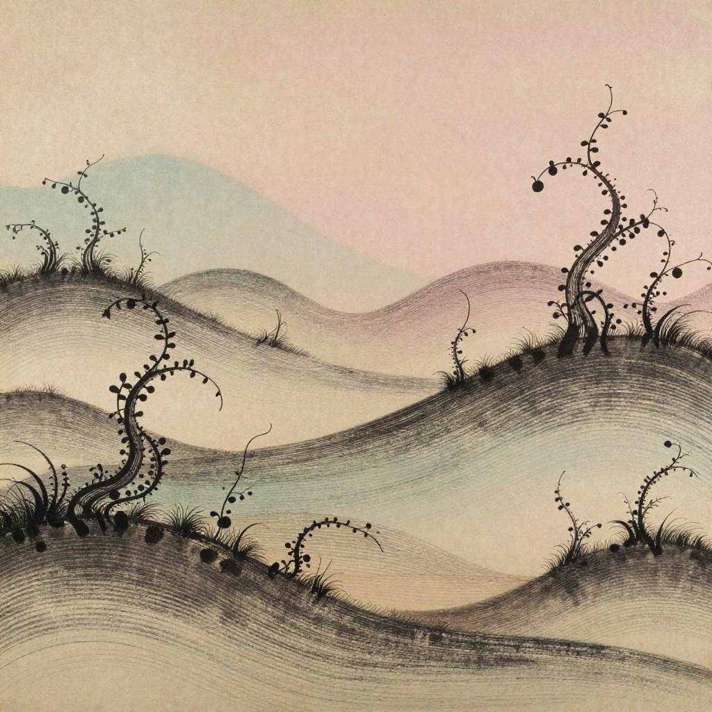 Intricate black ink drawing of wavy hills with delicate, curling branches and small buds against a soft gradient background of peach and pale blue.