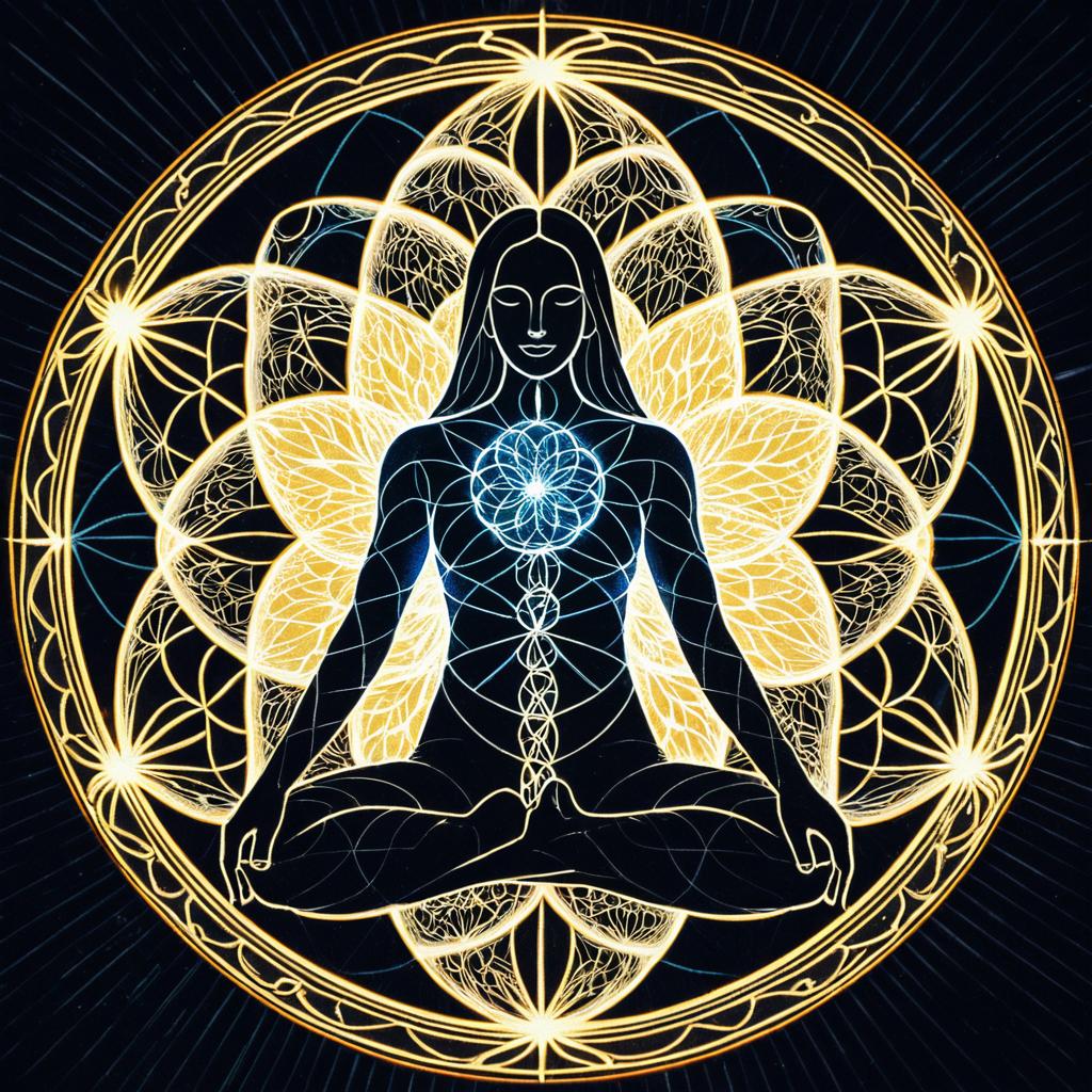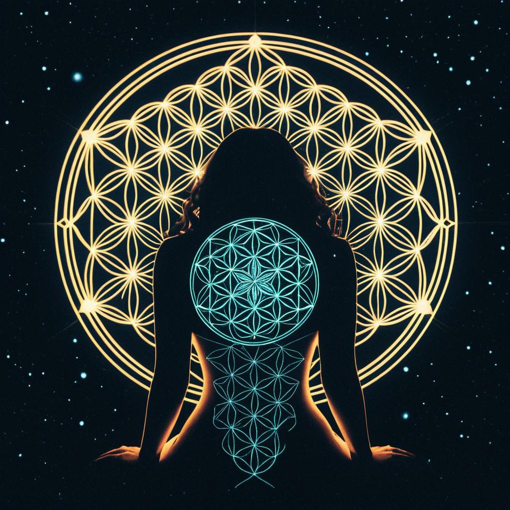 The flower of life glowing as a torus around the human form, radiant lighting, intricate line work, spiritual theme