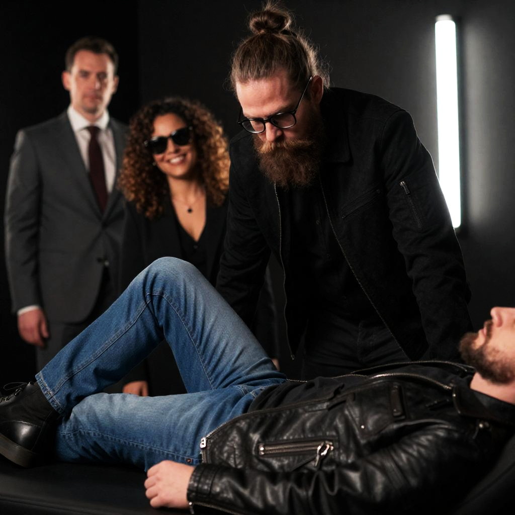 Photograph of three people in a dimly lit room. A bearded man with a bun, glasses, and black jacket leans over a reclining person with blue jeans and a leather jacket. A smiling woman with curly hair and sunglasses stands behind them. Another man in a suit stands in the background. Reclining person's hand is visible. Bright fluorescent light on the right.