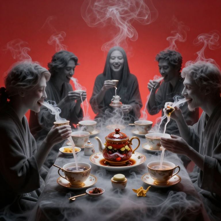 A floating tea party unfolds under a red sky where the guests—all made of smoke and shadow—sip from edible crockery that melts into fountains of laughter.