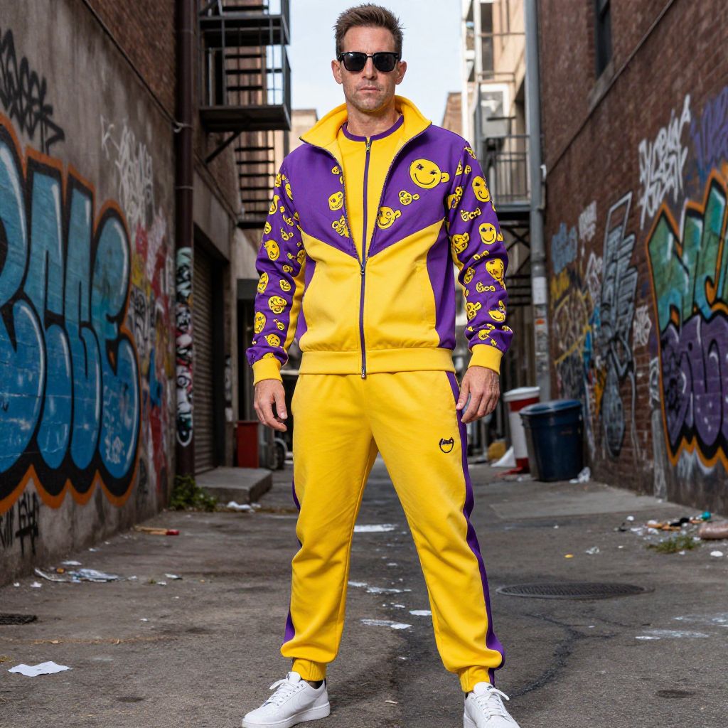 Saul Goodman tracksuit, modern streetwear with sharp lines and quirky patterns, bright color palette featuring yellows and purples, posing confidently in a gritty city alley with graffiti walls, dynamic lighting and realistic shadows, stylized realism.