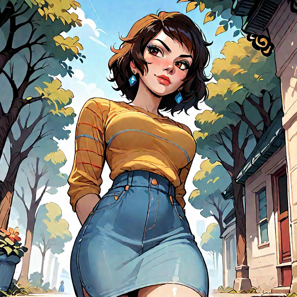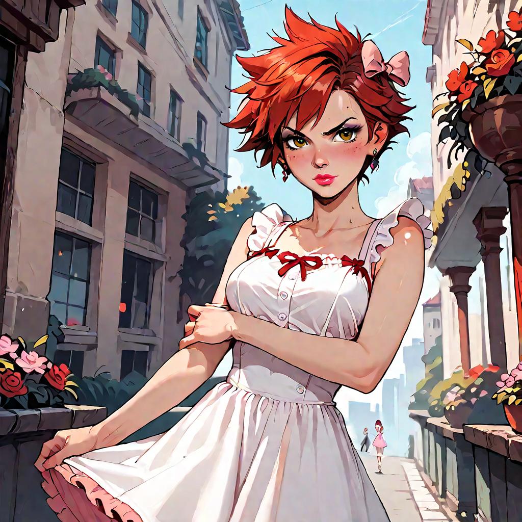 Score_9, tomboy, medium breasts, red hair, short hair, spiked hair, brown eyes, embarrassed, angry, blush, grabbing own arm, frilled dress, pink dress, sundress, long dress, hair bow, earrings, cowboy shot, solo, looking at viewer, outdoors, city, day, high resolution, Masterpiece, uncensored, rating_explicit