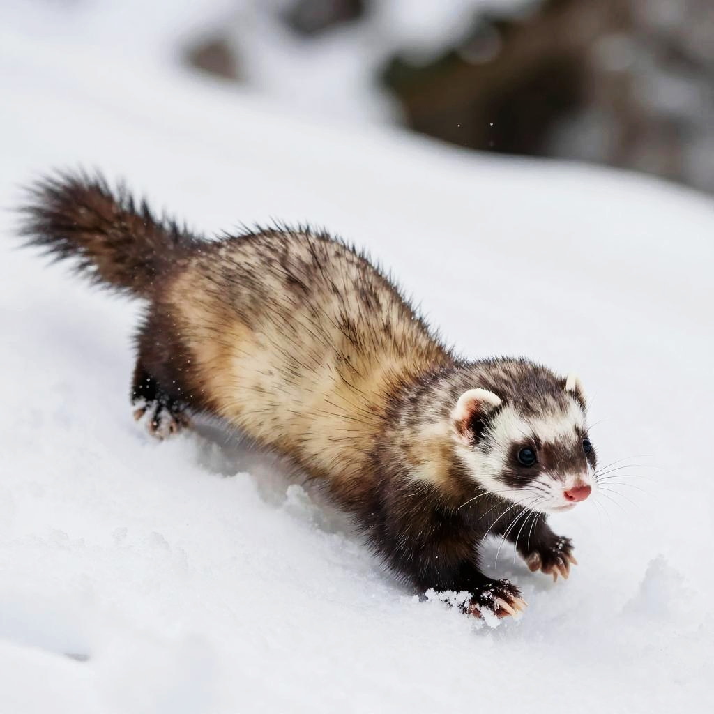 Ferret full body sliding down a snowy hill, dynamic motion blur effect, winter landscape background, crisp cold atmosphere, high detail in fur and snow particles