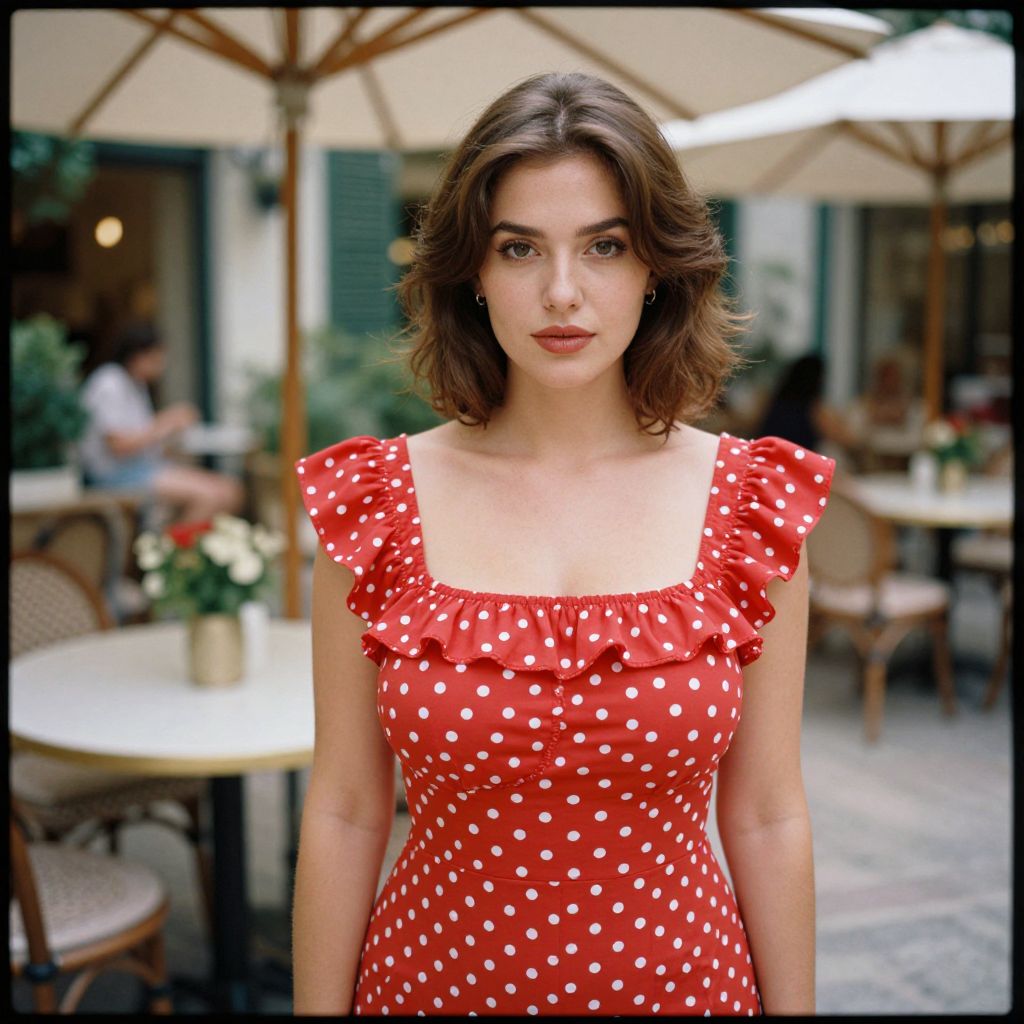 A woman in a playful summer style, wearing a ruffled red dress with polka dots and a square neckline, standing in a charming courtyard cafe, captured in a pinhole camera visual style. Sexy. Pretty face and beаutiful eyes. Big breasts