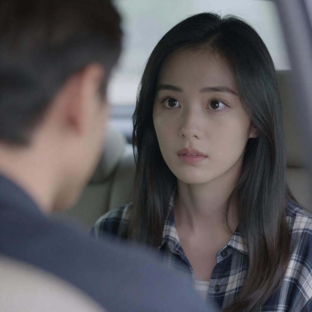 Close-up portrait of two young Asian women with similar long brown hairstyles. The woman on the left with light brown eyes gazes sideways holding a metal chain in her right hand. The woman on the right with dark brown eyes looks directly into the camera with a serious expression. Their reflections are visible in a mirror behind them. The background is softly blurred, emphasizing their faces and emotions.