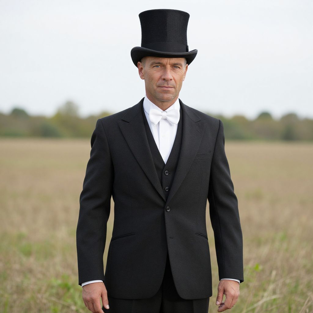 Mary Poppins Man Costume, man in a top hat and a suit standing in a field