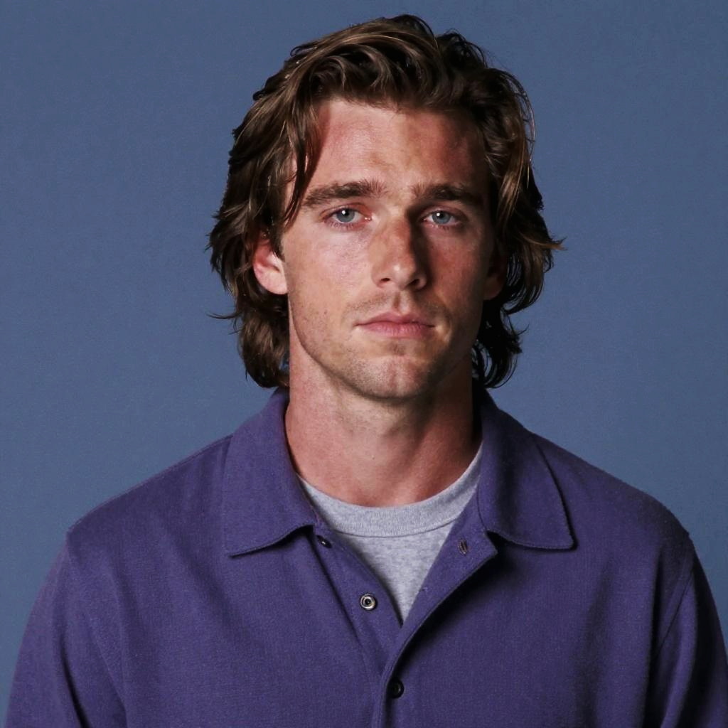 Tobey Maguire long hair with natural waves, vintage 90s fashion, cool blue and purple color tones, studio setting, sharp focus on eyes, film grain effect