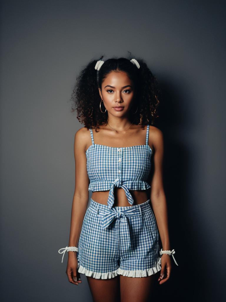 Portrait of a young woman with curly hair styled in twin ponytails, wearing a matching blue and white gingham two-piece summer outfit. The outfit includes a crop top with thin straps, buttons, and a ruffled hem tied in the front, paired with high-waisted shorts featuring a self-tie belt and ruffle trim. She accessorizes with white scrunchies on her wrists and large hoop earrings, standing against a plain dark gray background.
