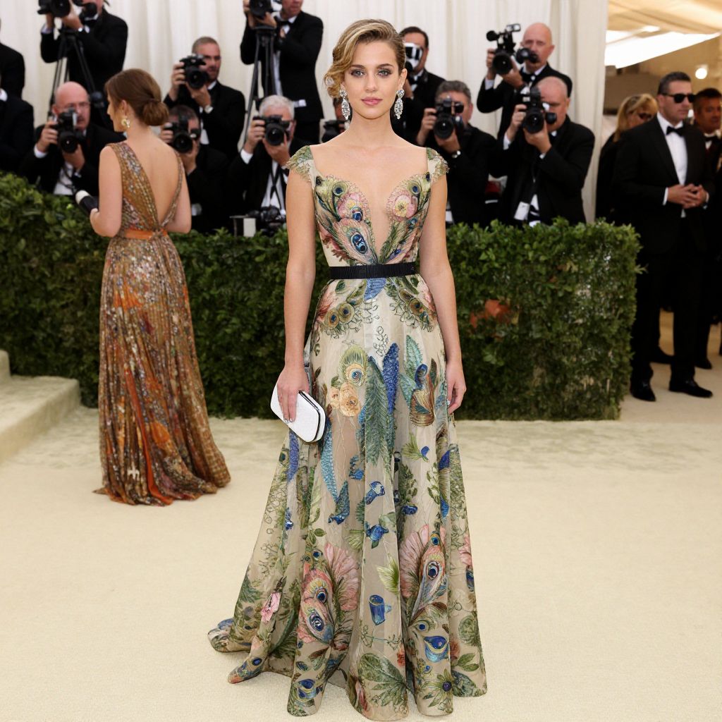 Elegantly poised on the red carpet at the Met Gala 2015, a woman dazzles in a floral-patterned gown featuring peacock motifs, complemented by sparkling earrings and a white clutch, as photographers capture her presence against a backdrop of formal attendees and manicured greenery.