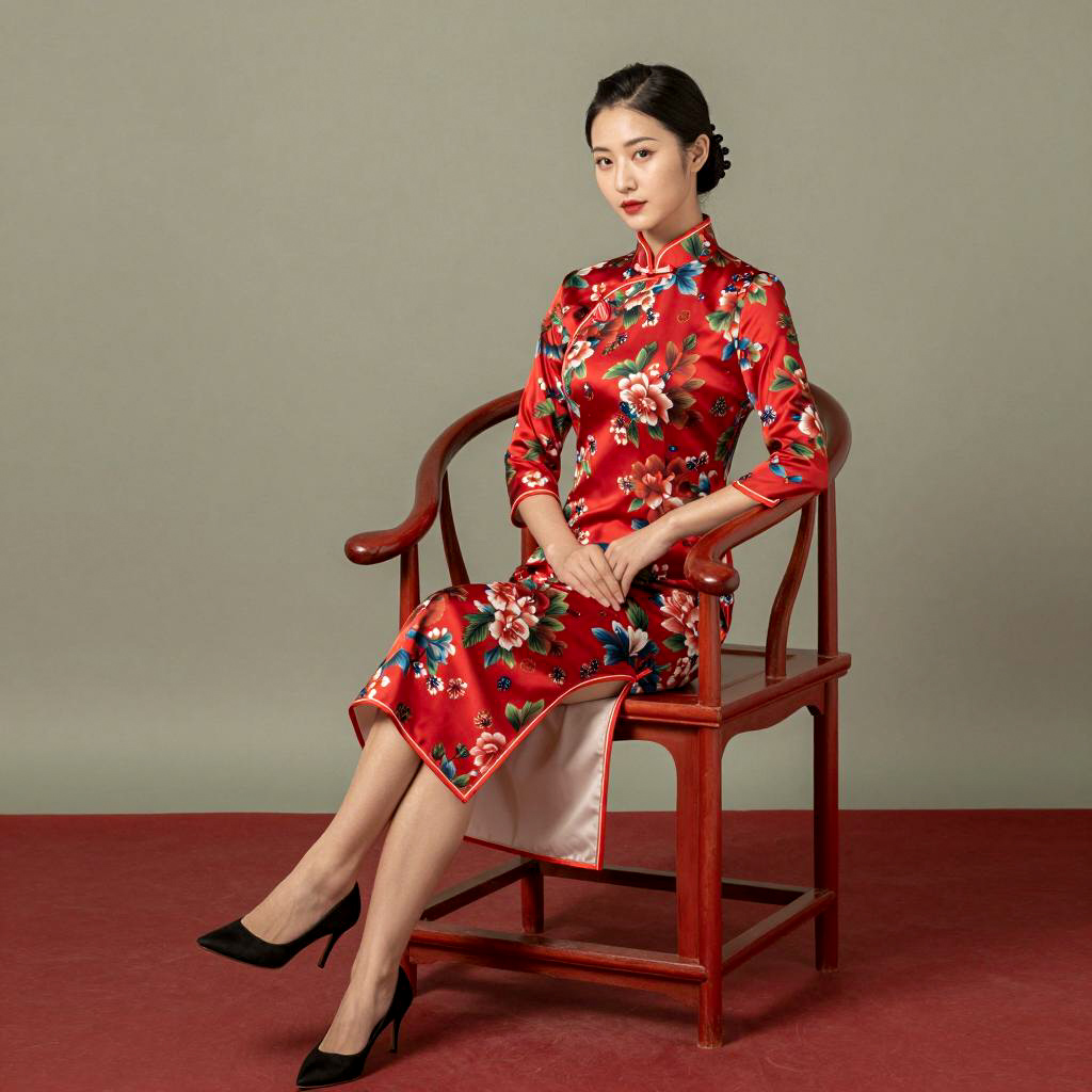 Asian woman in a red floral qipao, sitting on a red wooden chair. Floral patterns on qipao, long sleeves, high collar, red and white flowers. Black hair in bun with small black beads. Hands resting on lap, legs crossed. Neutral green background. Red qipao extends to floor, red fabric drapes below. Small red stamp on qipao. Photographic style.