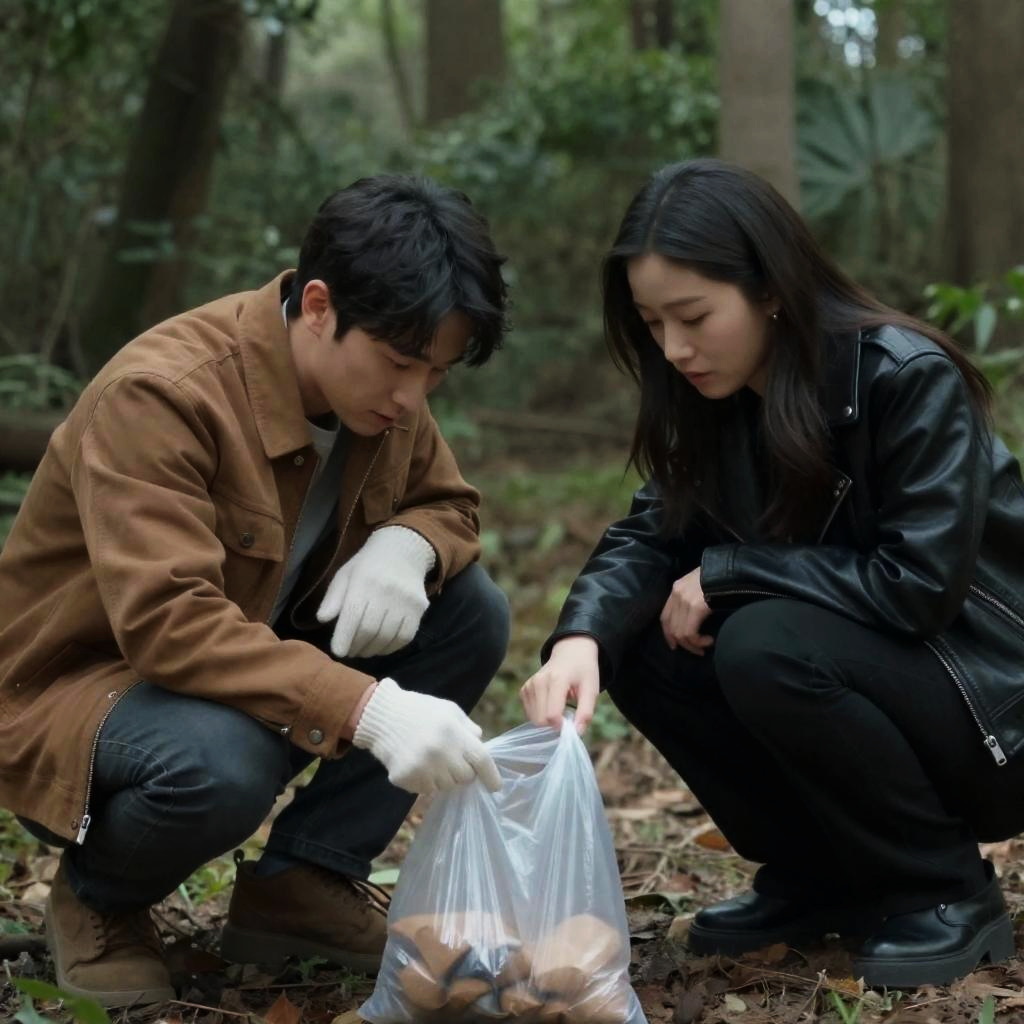 A young man and woman crouching in a dense forest, intently looking at a transparent plastic bag containing mushrooms or similar forest items. The man wears a brown jacket, white gloves, and dark pants, while the woman wears a black leather jacket and black pants. The background is filled with green foliage and tall trees.