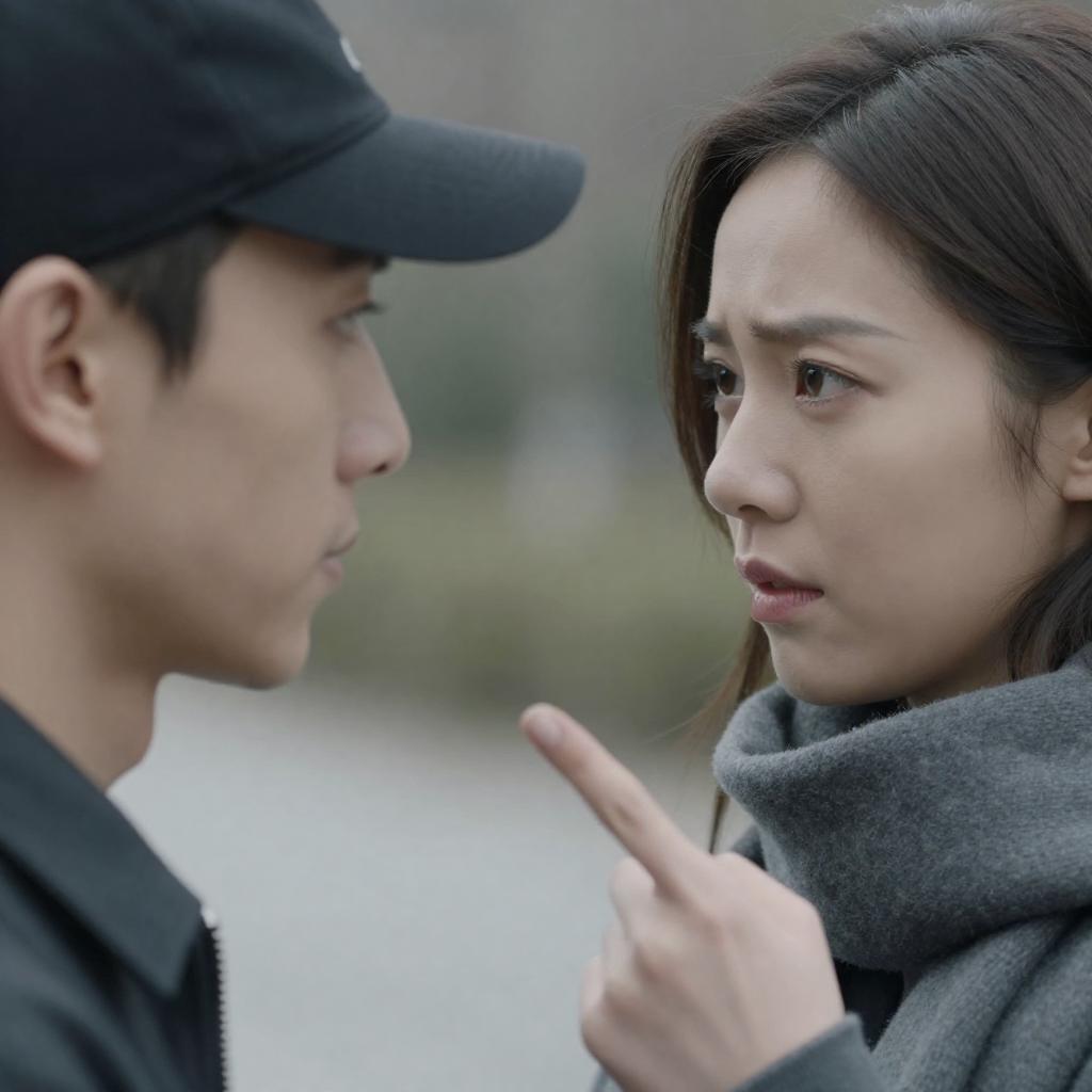 Two people crouching in a forest, focused on a transparent plastic bag on the ground. Man in brown jacket and white gloves, woman in black leather jacket. Dense foliage background. Man on left, woman on right, both intently looking at bag.