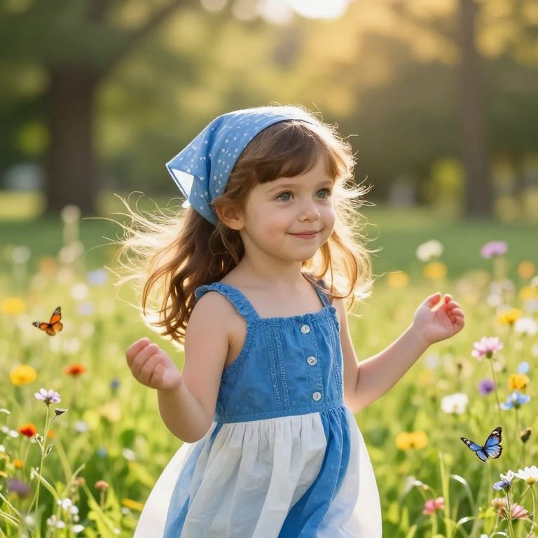 A young girl with soft brown hair, gently flowing in the breeze, is wearing a cheerful blue and white dress with a delicate blue headscarf that ties neatly at the side. She stands in a sun-dappled meadow, smiling warmly with her hands slightly raised, as golden sunlight filters through the trees behind her. The scene is bright and inviting, capturing a sense of innocence and joy. She has large, expressive green eyes that sparkle with curiosity, a slightly crooked smile, and a natural, carefree expression that reflects her happy mood. The meadow is lush and vibrant, with wildflowers in various colors blooming gently in the grass, and a few butterflies flitting between the blossoms. The sunlight creates soft shadows and warm highlights, enhancing the serene and peaceful atmosphere, making the entire scene feel like a moment of pure, unspoiled happiness.
