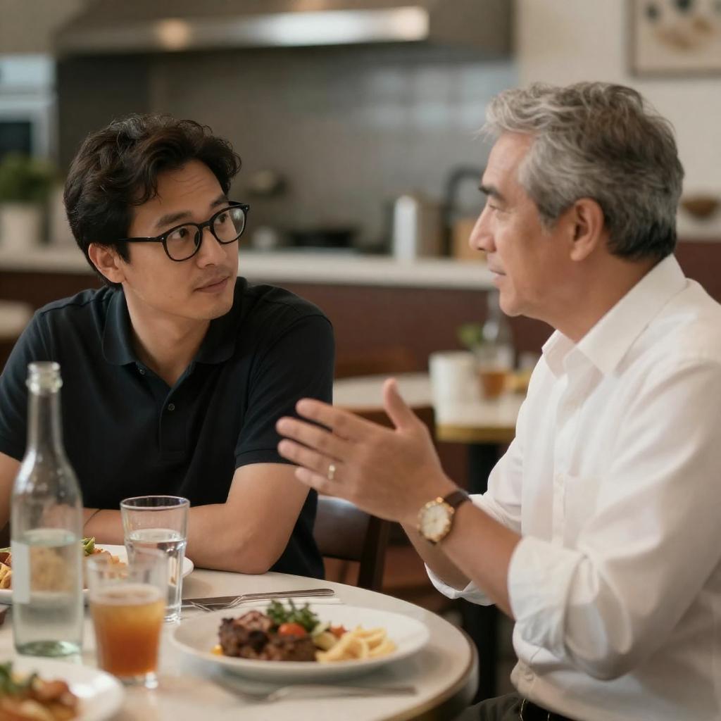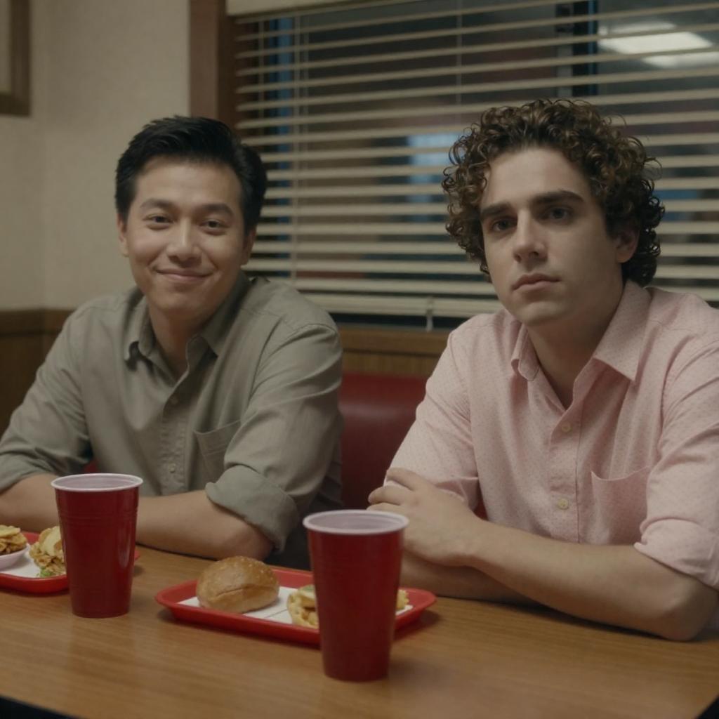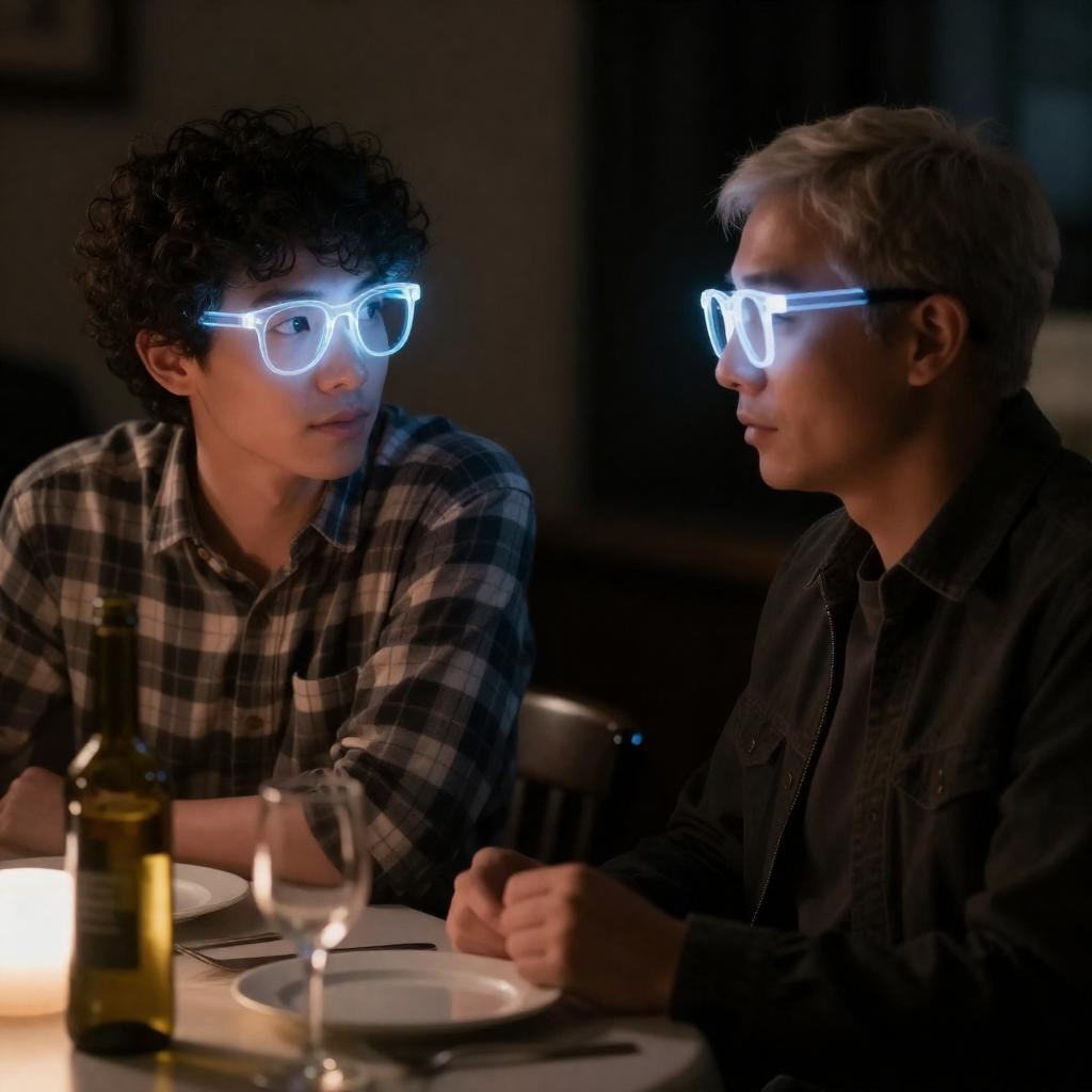 Photograph of two men at a dimly lit table, illuminated by glowing glasses and a bottle. The man on the left has curly dark hair, wears a plaid shirt, and looks intently at the man on the right, who has short, light-colored hair, wears a dark jacket, and gazes back. Plates and utensils are on the table.