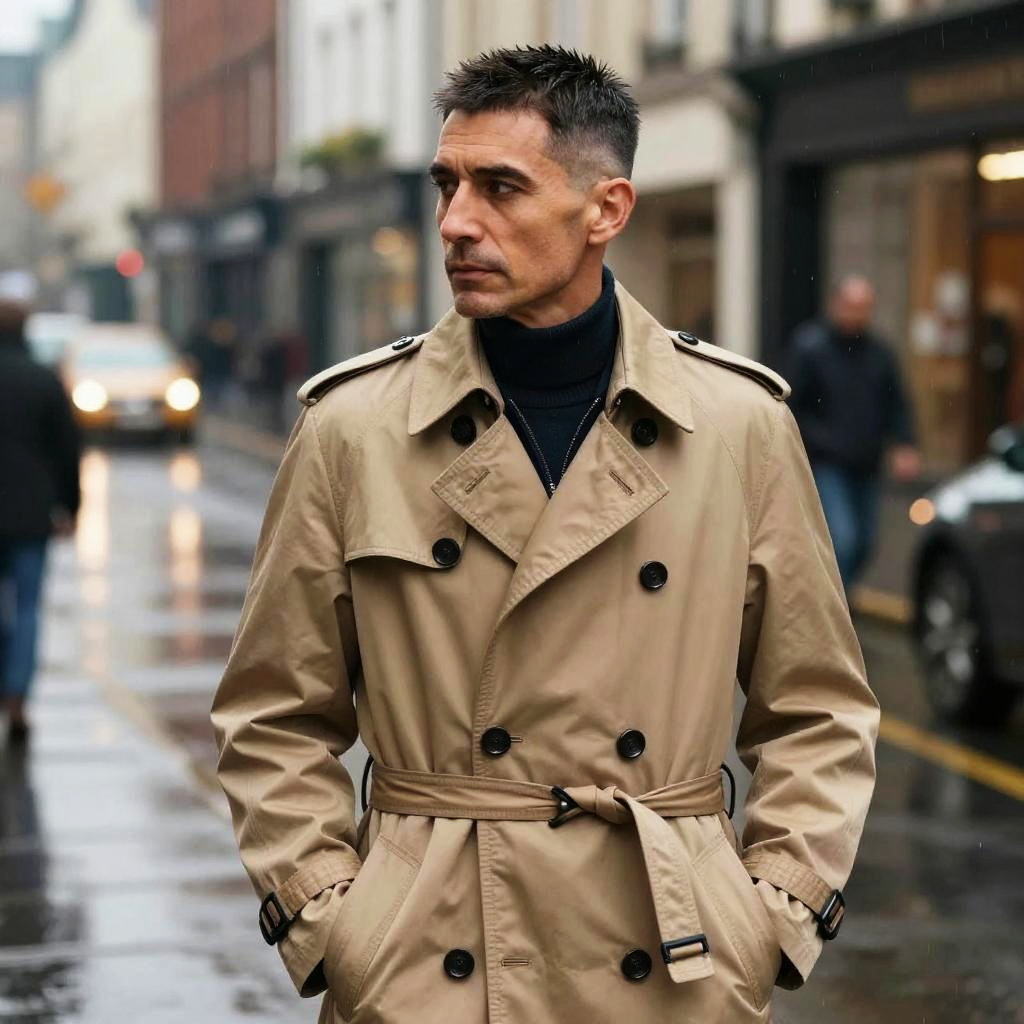 Textured Crop hairstyle on middle-aged man, wearing classic trench coat, in rainy city street, captured in fashion editorial style with reflected wet street light.