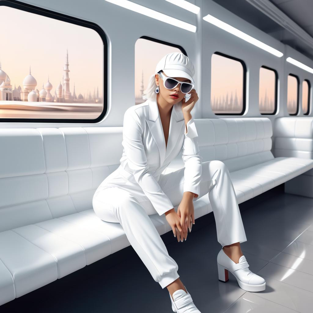 A charismatic leader wearing a white jumpsuit, white domino mask, and white platform shoes, sitting on a train with her head resting on her hands, digital art, highly detailed, 4K resolution