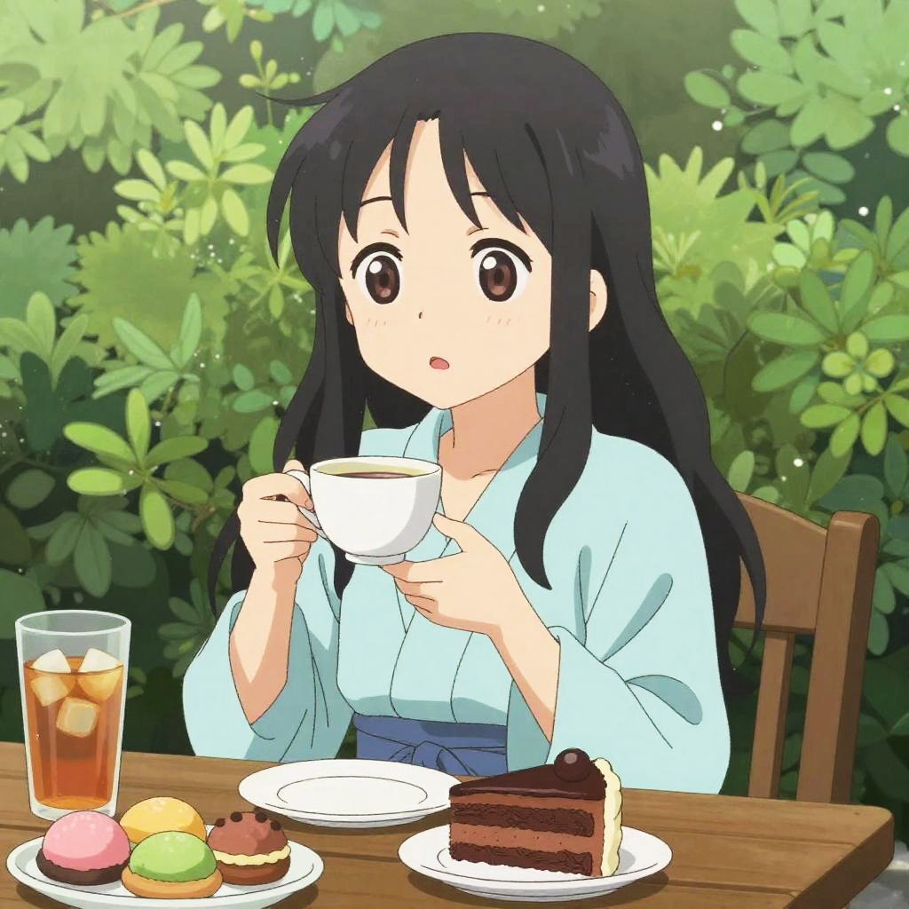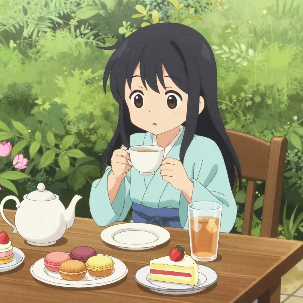 Anime-style drawing of a black-haired girl in a light blue kimono, sipping tea outdoors, surrounded by desserts and a glass of water.