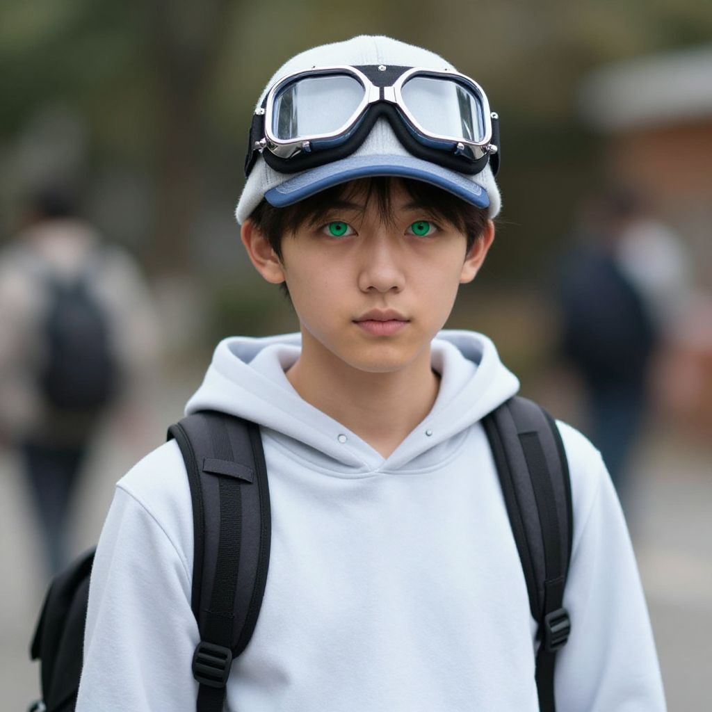 Photograph of a young boy with light skin and green eyes, wearing a white hooded sweatshirt and black backpack. He has dark brown hair peeking out from under a white helmet with black and white goggles on top. The background is blurred, showing indistinct figures and greenery, suggesting an outdoor urban setting. The boy's expression is neutral, and the image has a slightly surreal, enhanced color effect, making the colors appear more vibrant. The focus is sharp on the boy's face, while the background remains out of focus.
