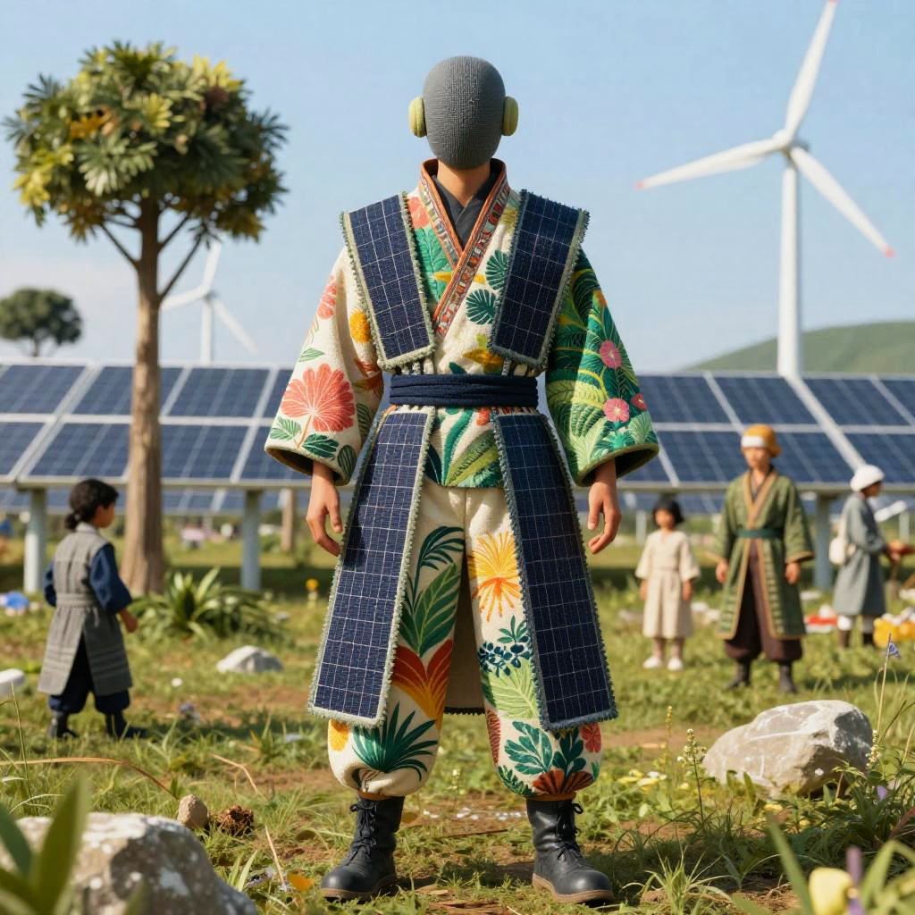 Clothes solarpunk futuristic wear combining traditional and innovative textile weaving, with solar fabric patches that store energy, bright patterns mimicking plant life, worn by a community member in a clean energy utopia with towering solar trees and wind turbines, vibrant and textured.