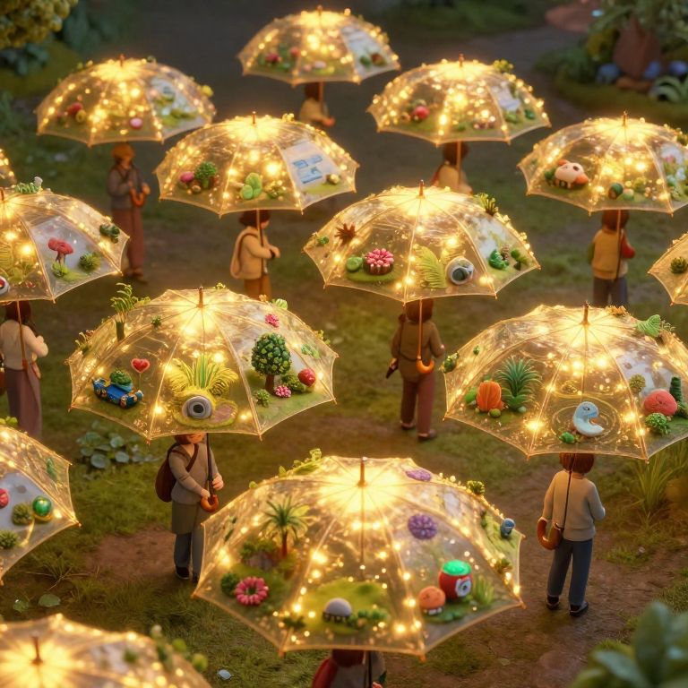 A whimsical digital art rendering depicts an enchanting procession of sentient umbrellas, each illuminated with golden light and adorned with vibrant miniature ecosystems, creating a surreal and magical atmosphere.