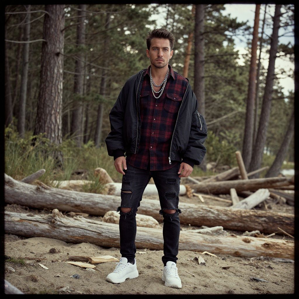 A man, plaid flannel shirt in dark red and black, distressed ripped skinny jeans, oversized black bomber jacket, chunky white sneakers, layered silver chain, hidden cove surrounded by towering pine trees, sun-dappled shore, driftwood scattered along the sand, daguerreotype film style, contemplative expression. Man has masculine face and piercing eyes