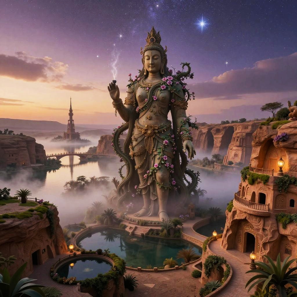 A towering humanoid statue entwined with flowering vines set within desert cliffs with carved dwellings and oasis pools, wrapped in ethereal mist and drifting incense, glowing stars scattered above, a celestial vault painted with warm amber and lavender twilight with scattered stars. Tranquil waters mirror the heavens, distant spires and bridges on rocky arches, lantern-lit sanctuaries and mossy terraces, a serene dreamlike atmosphere with surreal, intricate details; cinematic composition, volumetric fog and light rays, hyper-detailed textures, high dynamic range, wide-angle vista, depth of field, soft rim light, subtle film grain, epic scale.