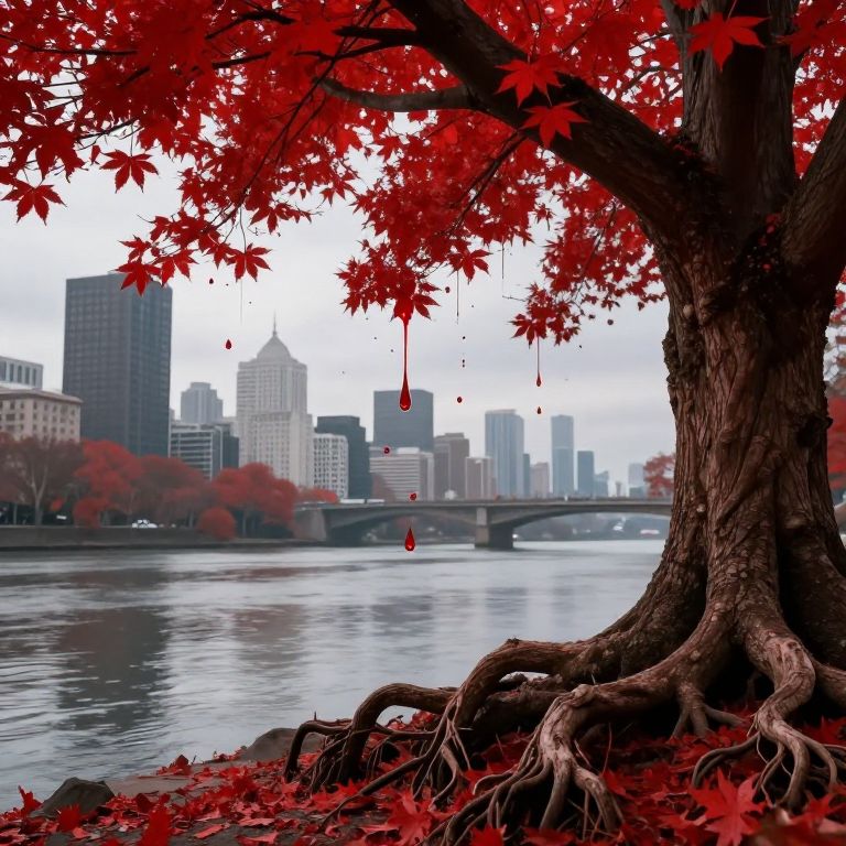 Crimson leaves cascade downward from an inverted tree, its gnarled roots sprawling across a cityscape as blood-red droplets fall like tears onto a river below, creating a haunting contrast against the urban skyline.