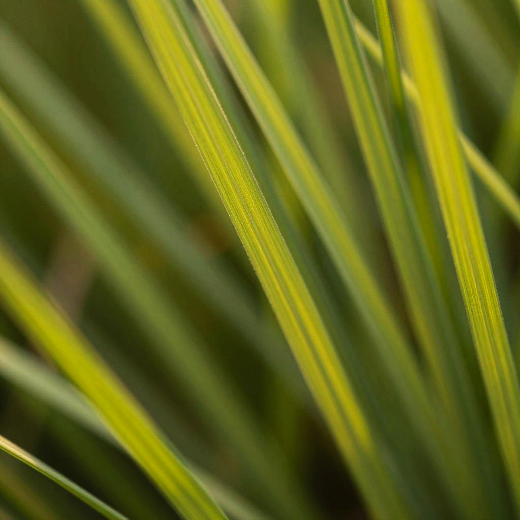 Close-up photograph of vibrant green grass blades with yellow stripes. The image focuses on the sharp, elongated leaves, showcasing their fine, textured surface. The blades are angled diagonally, creating a dynamic, radial pattern against a blurred, dark green background. Sunlight highlights the yellow stripes, adding contrast and depth. The photograph emphasizes the natural beauty and detail of the grass, with a shallow depth of field that keeps the foreground blades in sharp focus while the background remains softly blurred.