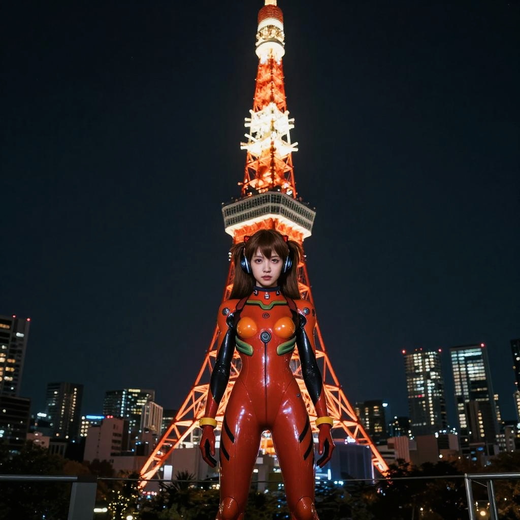 Realistic far wide-angle photo, photorealistic, (HDR image:1.15), ultra-detailed face, shiny eyes looking at the far end, (with an hourglass perfect body shape:0.2), (wearing in Asuka Langley Sohryu (plugsuit 02:1.2) with interface headset), standing at the top of Tokyo Tower (in dark night), soft lighting