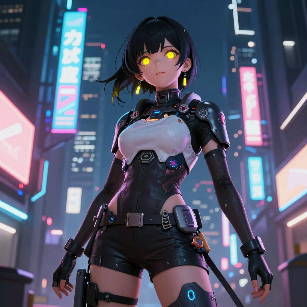 Cyberpunk female character art in a dystopian urban setting, blending traditional Japanese elements with futuristic tech, glowing katana, robotic limbs, soft neon glows on armor, complex textures, dramatic shadows, hyper-realistic style