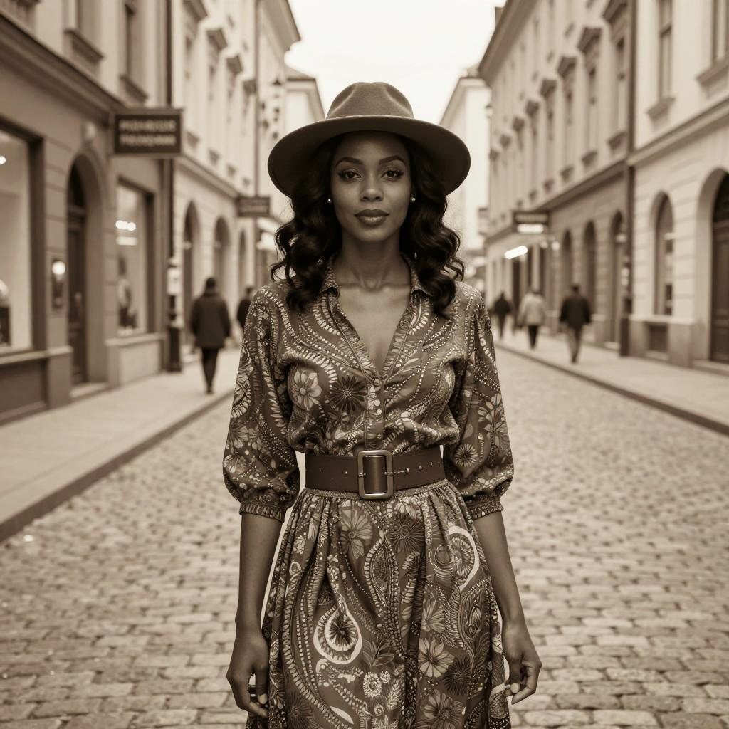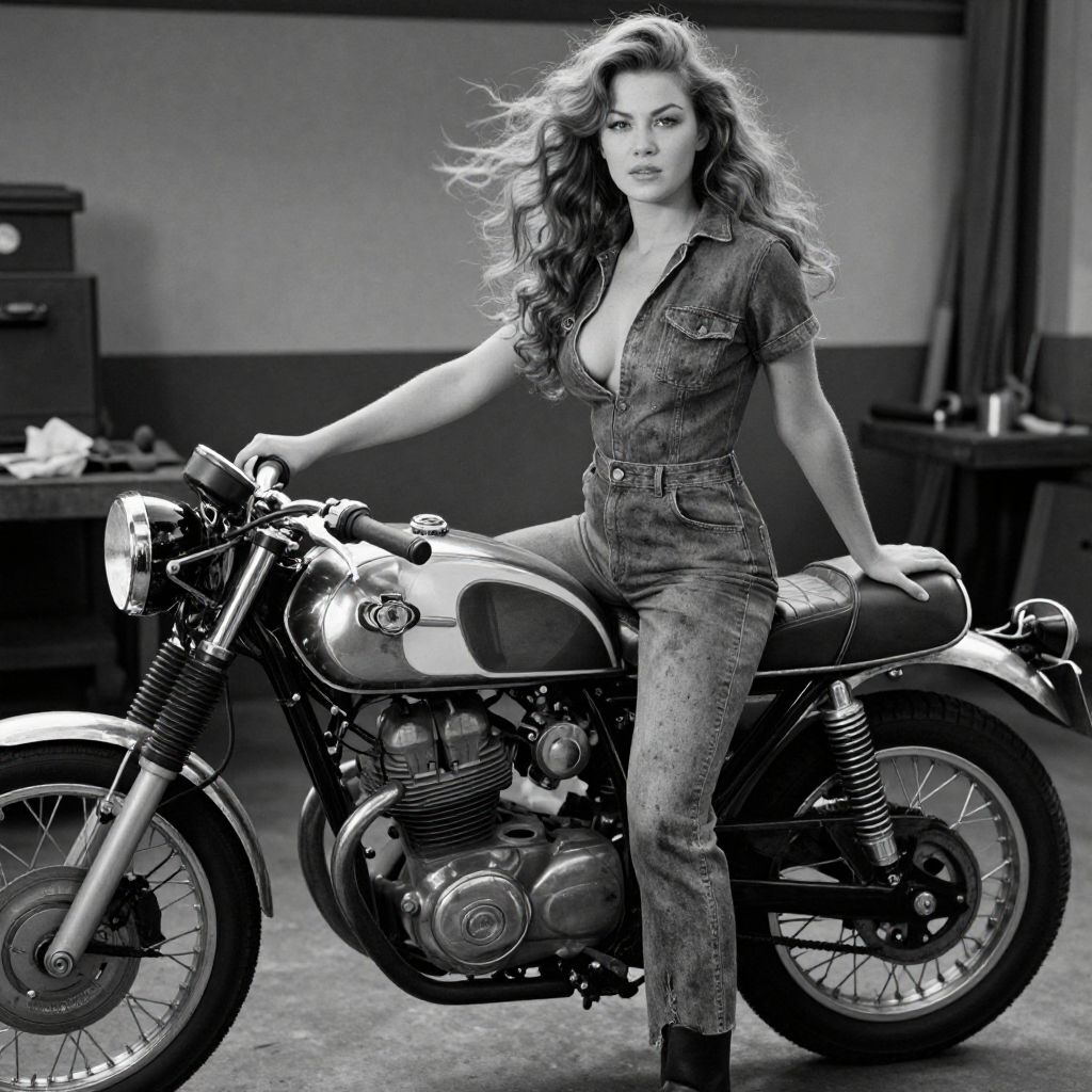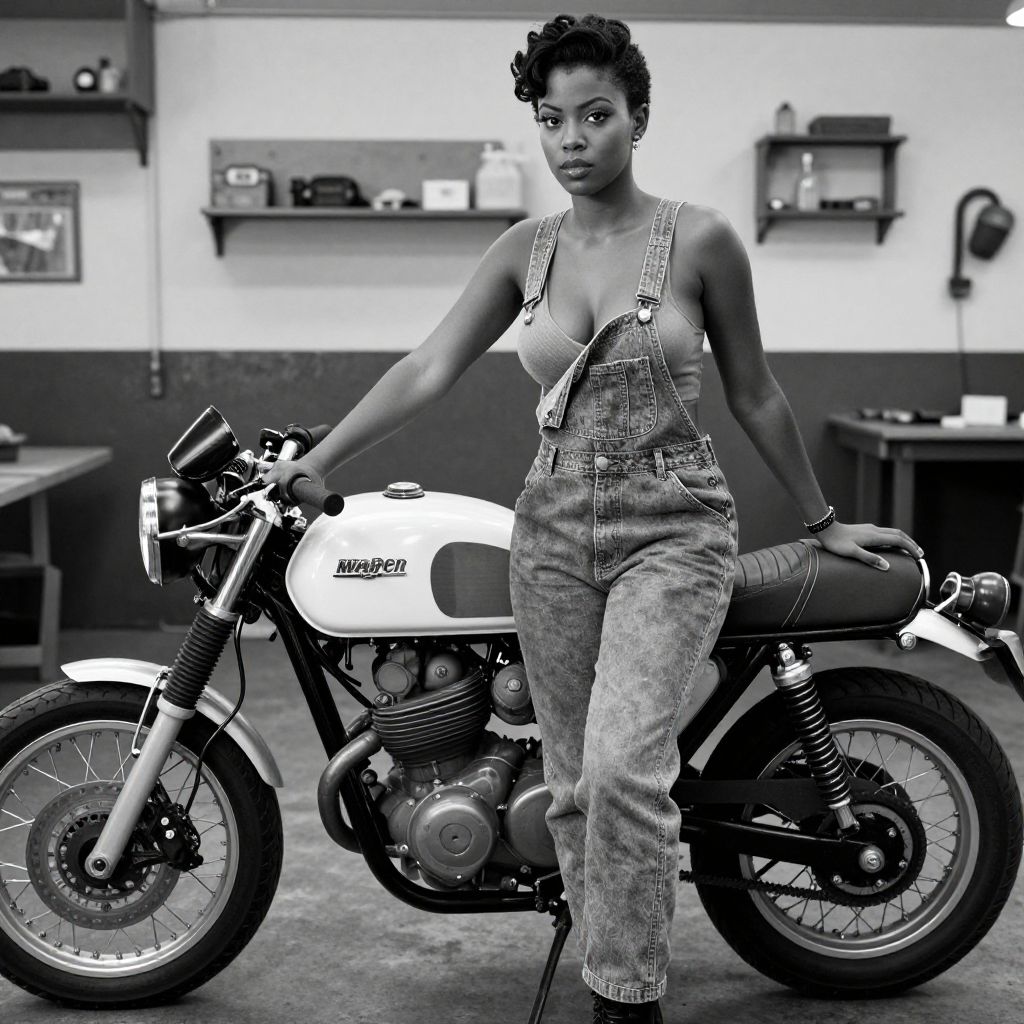 A stunning black woman in a motorcycle repair shop, wearing a dirty overall with a deep v-neck, stands next to her caferacer scrambler, exuding drama and realism in a 50s-inspired black and white 4K photo by Fan Hu.