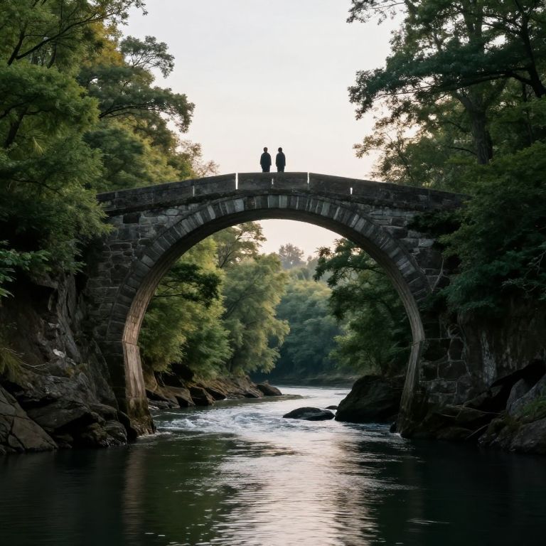Silent figures stand atop a stone arch bridge, spanning the tranquil waters between towering, forested cliffs under a soft, hazy sky.