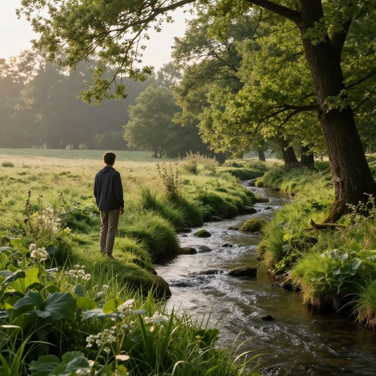 Photograph of a stone arch bridge spanning a calm river, with two silhouetted figures standing at the top. The bridge is constructed from dark, weathered stones and features an arched shape. Surrounding the bridge, dense green foliage from tall trees frames the scene, with sunlight filtering through, casting a soft glow. The river below reflects the greenery and sky, with a gentle current visible. The background shows a bright sky transitioning from day to evening. The image has a serene, picturesque quality, emphasizing natural beauty and tranquility.