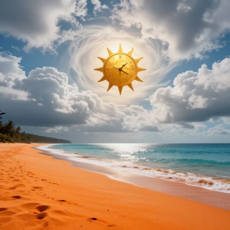 Photograph of a vibrant, orange sandy beach with turquoise waves under a bright, sun with a clock face in a cloudy sky.