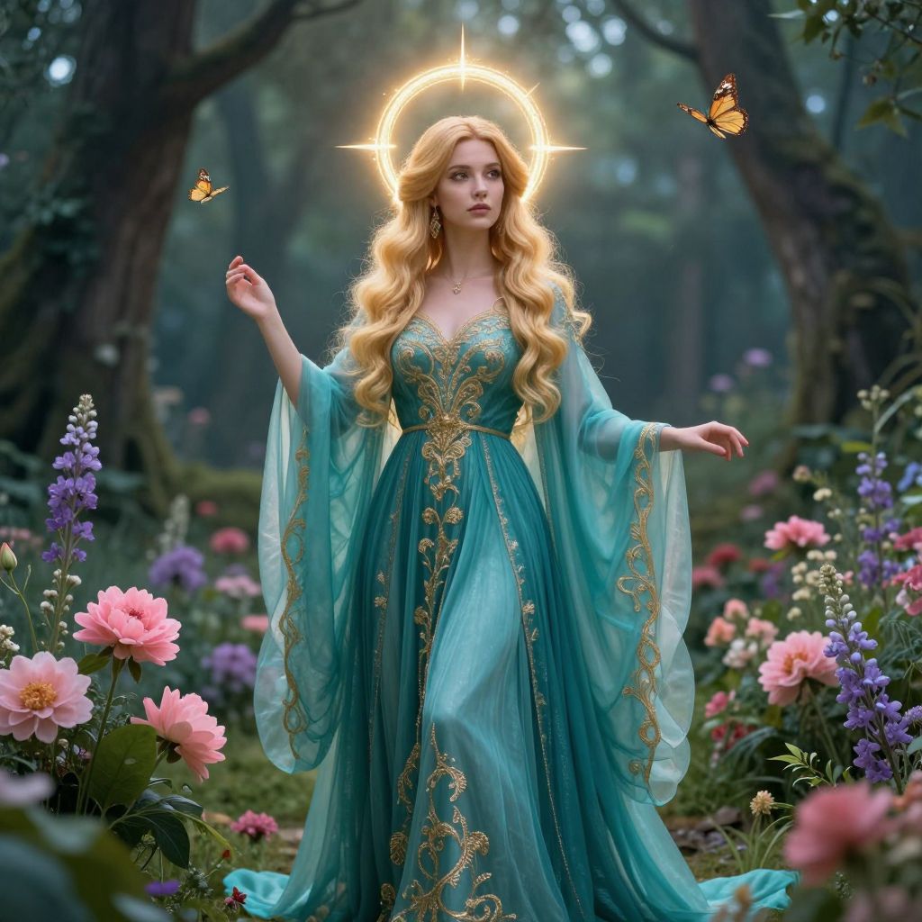 Clairvoyant woman stands ethereally amidst a mystical forest, her golden hair cascading around a radiant halo as she wears a flowing teal gown adorned with intricate gold embroidery, surrounded by vibrant pink and purple flowers and fluttering butterflies.