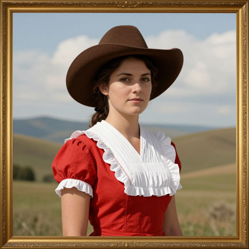 Vintage Texan portrait by Julius Born captures a woman in an early 20th-century setting, featuring her wearing a wide-brimmed brown hat and a red dress with white ruffled sleeves, set against a serene landscape of rolling hills, distant mountains, and a partly cloudy sky framed by an ornate gold border.