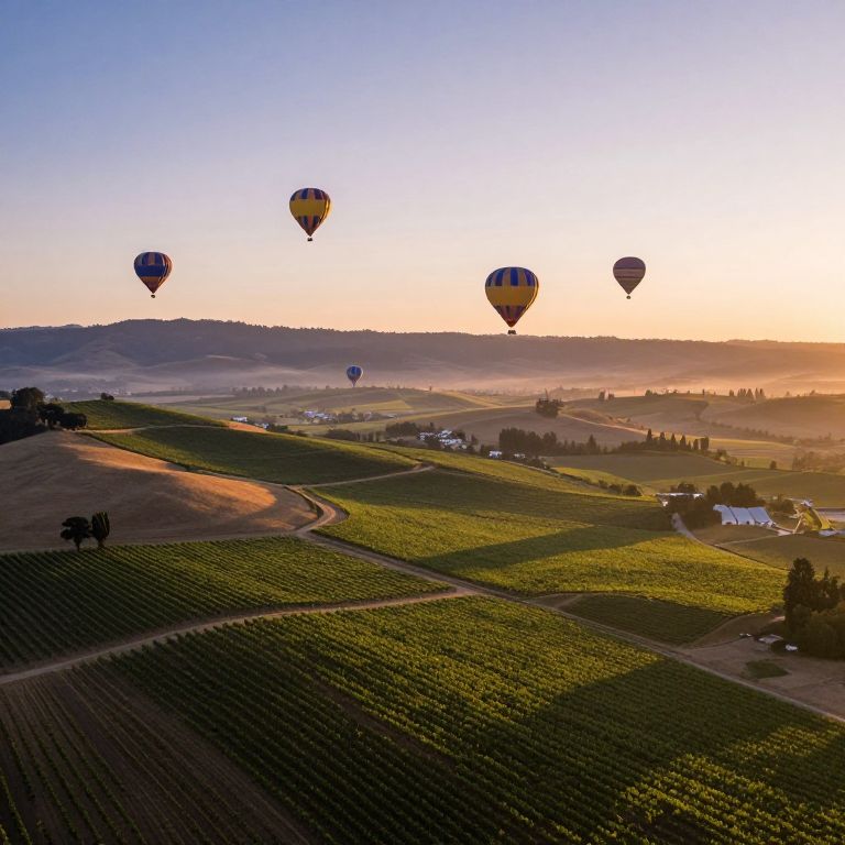 Napa hot air balloons flying over vast vineyard landscapes at dawn, colorful balloons gently drifting in soft pastel sky, patchwork of grape fields below with early morning light casting long shadows, serene and magical aerial view of Napa Valley.