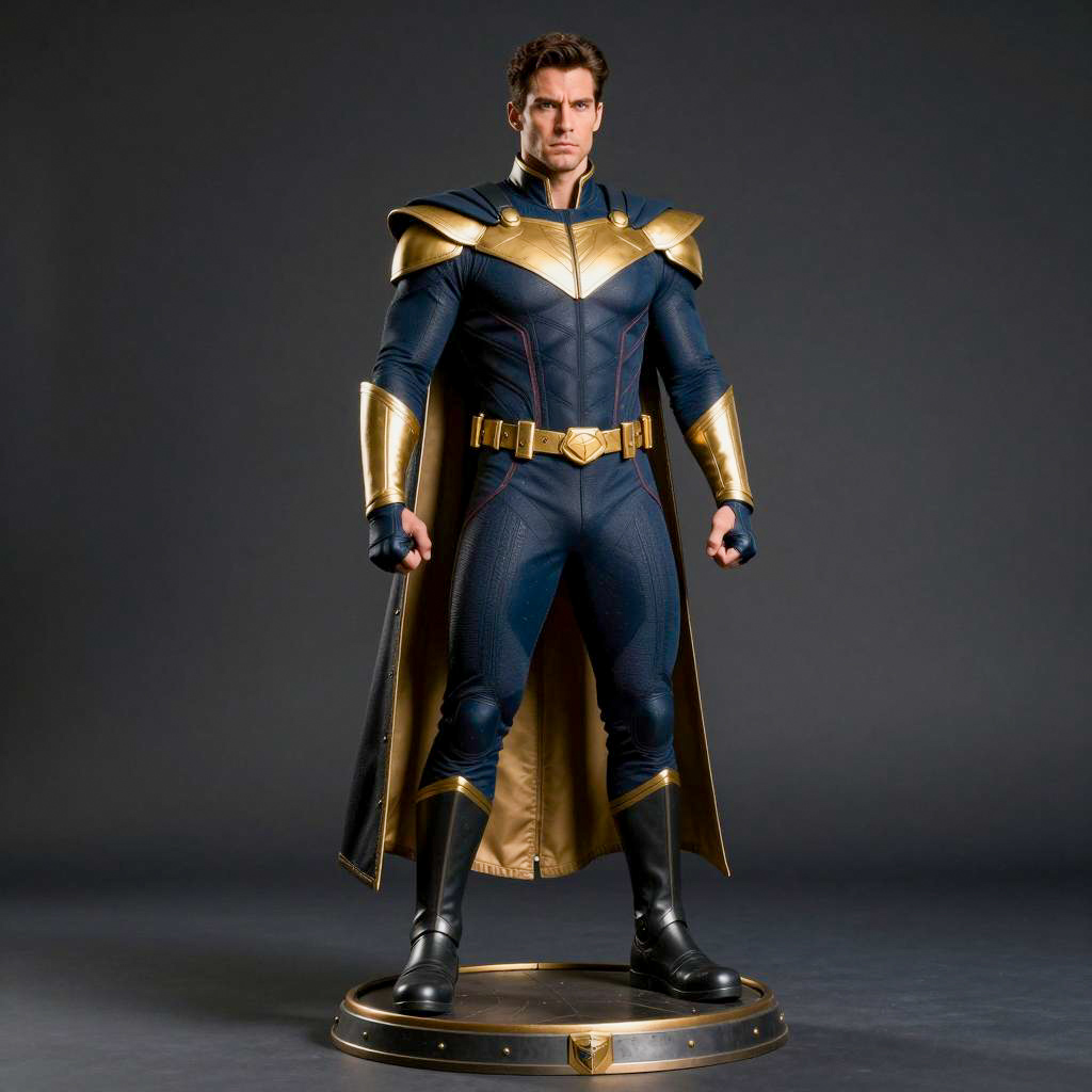 Photograph of a muscular man in a dark blue and gold superhero suit. He stands with legs slightly apart, arms relaxed at his sides. Suit has a high collar, gold accents, and a long coat-like section in the back. Black background. Short, dark hair, stern expression. Standing on a round, metal base with a small emblem.