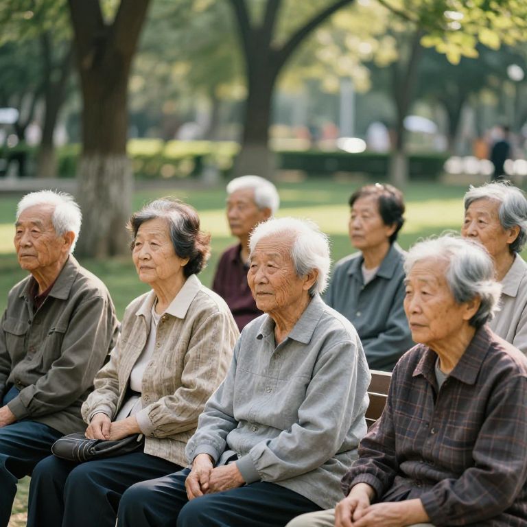 A group of elderly people sitting together in a sunlit park, each with unique expressions, showing signs of life and age, with natural lighting and a peaceful atmosphere