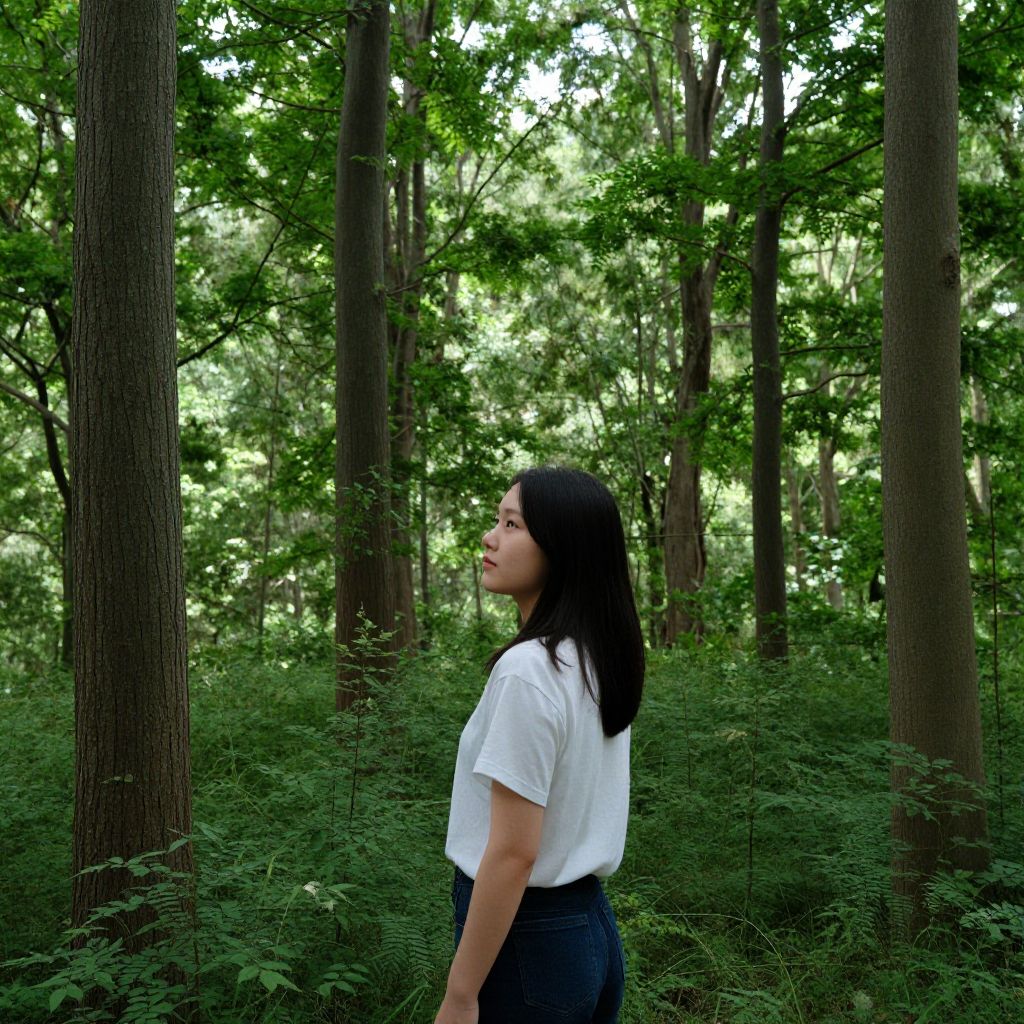 Young woman standing amidst a serene forest, her back turned to the camera as she gazes into the lush greenery, surrounded by towering trees and dappled sunlight filtering through the canopy.