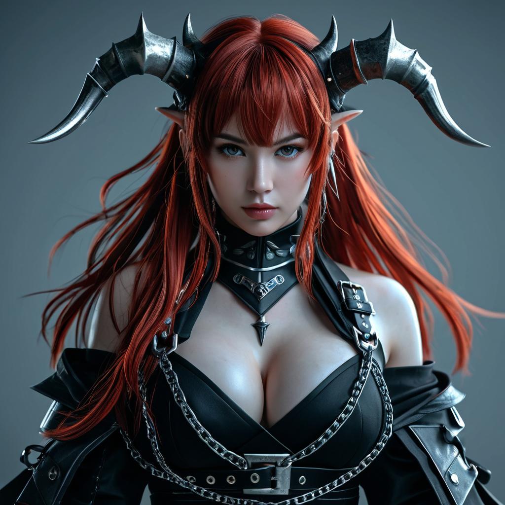 Blurry, depth of field, rating:safe, 1girl, surtr (arknights), blurry background, blurry foreground, chest strap, solo, breasts, red hair, bare shoulders, cleavage, black belt, belt, horns, medium breasts, black dress, off shoulder, looking at viewer, dress, grey background, long hair, bangs, hair between eyes, jacket, chromatic aberration, chain, poker-faced, Stretch your hands forward, the net be buckled