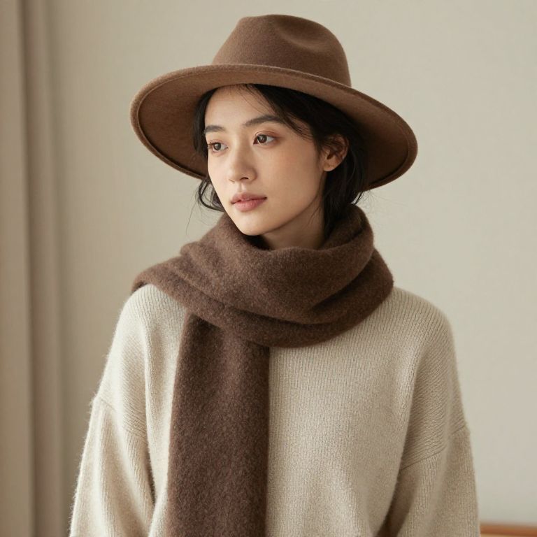Female wearing a beige sweater with a brown hat on her head and a brown scarf around her neck.