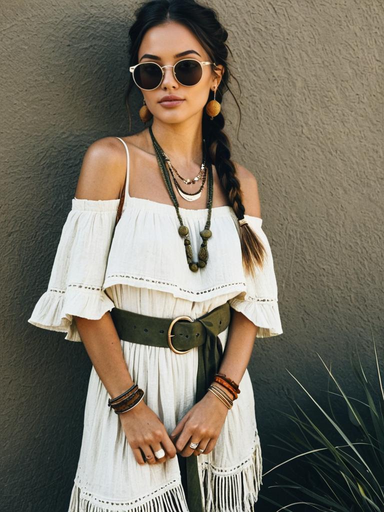 Woman, bohemian, white off-the-shoulder dress with vertical texture, long bell sleeves, olive green sleeveless vest with fringe detailing, cinched at the waist with a braided belt, round oversized sunglasses, layered necklaces.