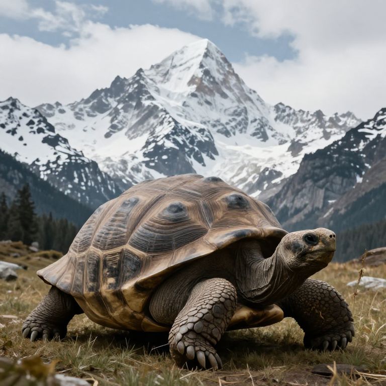 Serenity and timelessness converge as a colossal tortoise rests beneath towering snow-capped peaks, its ancient shell echoing the enduring rhythm of the earth, while the soft whisper of clouds above hints at the quiet, unyielding strength of nature.