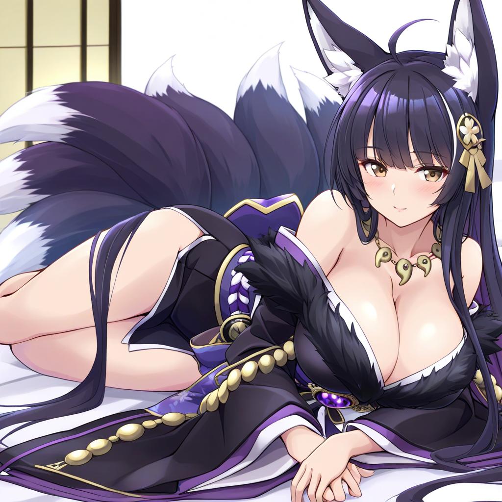 Digital anime-style illustration of a voluptuous, fair-skinned female character with long, straight black hair and large, white-tipped fox ears. She has golden eyes and is wearing a revealing black and purple kimono with gold accents and a white fur trim, exposing ample cleavage. Her outfit includes a gold necklace and a purple ribbon on her upper arm. She is lying on her side on a white bed, with her bushy black and white fox tails behind her. The background features a traditional Japanese shoji screen. The character's expression is calm and slightly seductive.