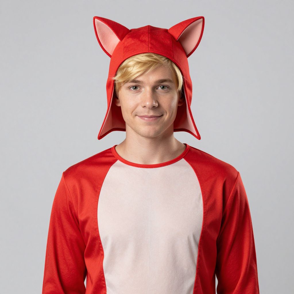 Photograph of a young blonde man with fair skin, wearing a red fox-themed hat and red and white raglan shirt, smiling against a light blue