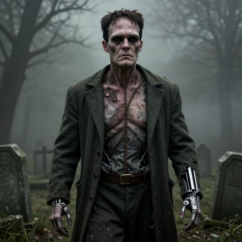 Accurate Frankenstein's monster art visualizing the creature in a desolate, fog-filled graveyard, tattered clothes, patched flesh and visible stitches, dramatic and bleak color schemes with grey and green tones, hyper-detailed anatomy that combines human and mechanical parts, moody and cinematic horror style capturing pathos and menace.