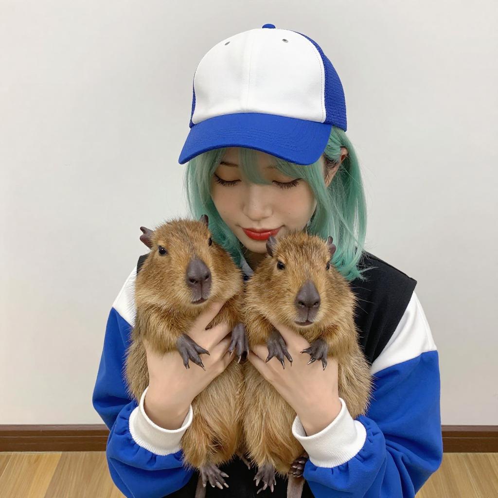 Photograph of a person with light green, shoulder-length hair, wearing a blue and white hat, black top, and blue and white sleeves, holding two small, brown, furry animals close to their face. They have red lipstick and are smiling. The background is a plain white wall with a wooden floor.