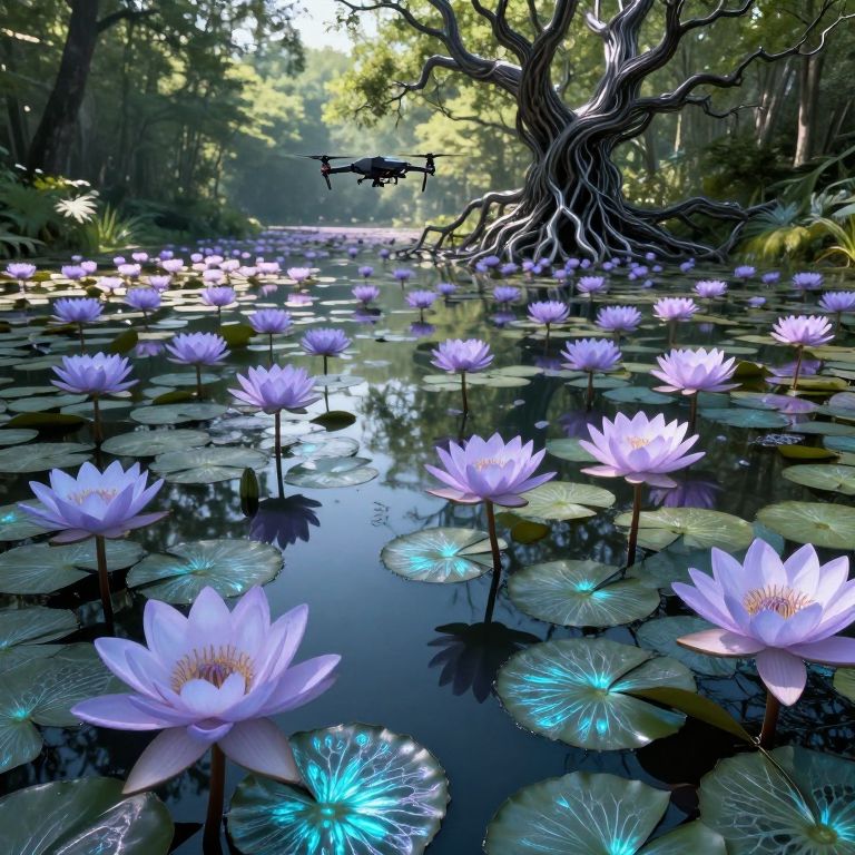 A captivating blend of dreamlike water lilies and unsettling biomechanical elements creates an enchanting yet eerie scene. From the perspective of a floating, shimmering drone, we observe a vast pond adorned with lush, iridescent flowers in ethereal hues of lavender and turquoise. The leaves of these unique flora exhibit intricate metallic veins that pulse mysteriously, suggesting an otherworldly presence. In the distance, a gnarled tree rises from the water, its branches intricately intertwined with metal tendrils that sway gracefully in the gentle breeze. As sunlight filters through the verdant canopy, it casts playful shadows across the pond, generating a mesmerizing interplay of light and shadow. This surreal landscape instills a sense of awe combined with unease, beckoning viewers to explore the enigmatic secrets concealed beneath its surface.